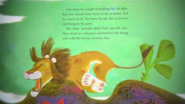 That's right! It's the Tawny Scrawny Lion by Kathryn Jackson and Gustav Tenggren. Both our hungry lions learn the valuable lesson that you just might discover an unexpected benefit from not chewing up and swallowing someone smaller than you. I mean, they might have a skill or an idea that can save your life (or save you some pain) later ... plus, you might gain a Scrabble partner.